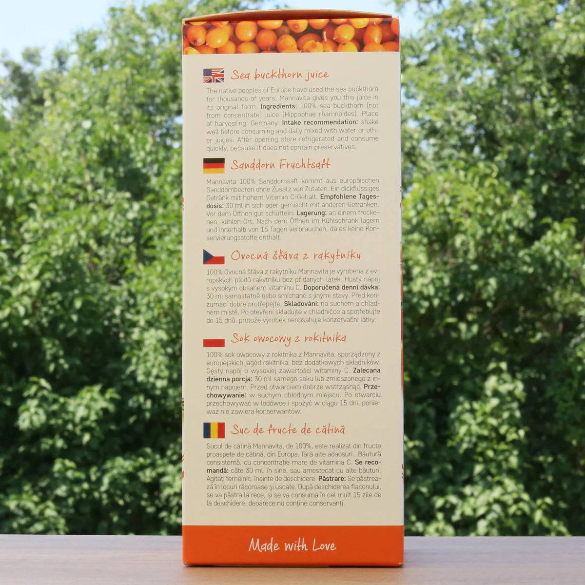 The Mannavita sok rakitovca je 100-% pijača, izdelana z uporabo nežen postopek za ohranitev edinstvene aktivne sestavine iz rakitovca. Rakitovec je jagodičevje bogat z bioaktivni vitamin C, znan po svojem za krepitev imunskega sistema lastnosti. Priporočljivo je ne le za boj proti obstoječim boleznim, temveč tudi kot vsakodnevna pijača za preprečevanje. Rakitovec je ena od najstarejše zdravilne rastline, ki vsebuje več kot 190 biološko aktivnih komponente.