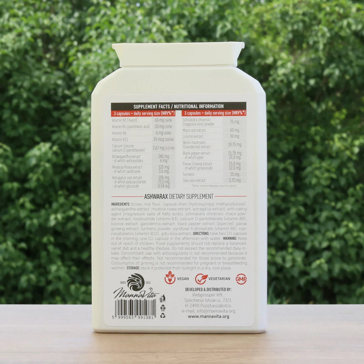 Ashwarax je zasnovan za lajšanje simptomov stresa, tesnobe, panike, nespečnosti in depresije. Vsebuje pametno kombinacijo izvlečkov iz 15 zdravilnih rastlin in vitaminov. Ne le rastline same, temveč tudi njihove koncentrirane aktivne spojine.